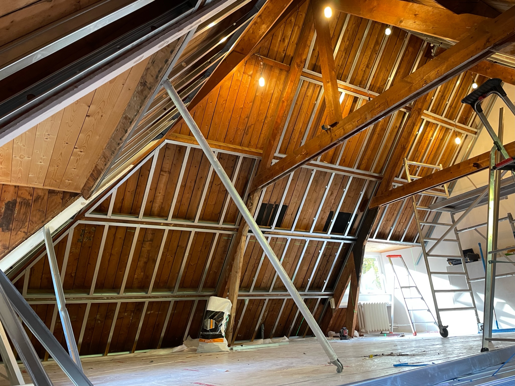 Nadat de metalen studs zijn geïnstalleerd, worden gipsplaten aan het raamwerk bevestigd met behulp van schroeven. Vervolgens wordt het plafondoppervlak afgewerkt met een laag stucwerk of verf om een glad, naadloos oppervlak te creëren.